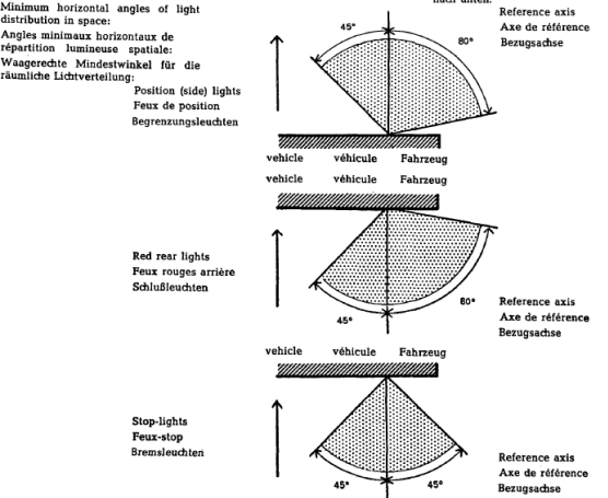 Begrenzungsleuchten, Schlußleuchten und Bremsleuchten: Mindestwinkel für die räumliche Lichtverteilung dieser Leuchten *)