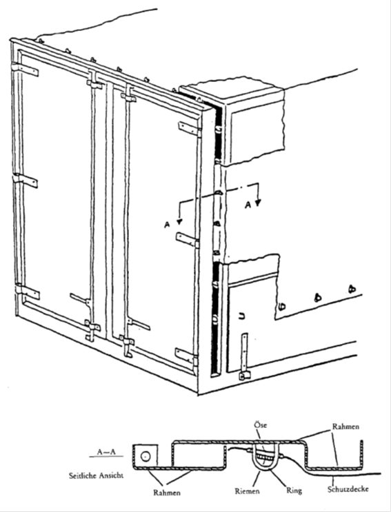 - Die Schutzdecke muß den festen Teil des Behälters um mindestens 250 mm, von der Mitte der Befestigungsringe an gemessen, überdecken, sofern nicht schon die Art der Konstruktion des Behälters als solche jeden Zugang zu den Waren verhindert.