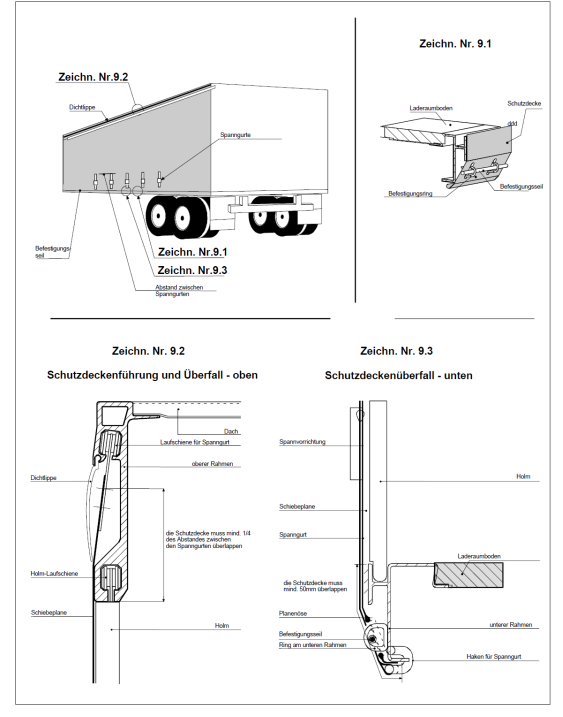- (iii) Die Führung der Schiebeplane und andere bewegliche Teile müssen so zusammengefügt sein, dass zollamtlich verschlossene Türen und andere bewegliche Teile nicht ohne Hinterlassung sichtbarer Spuren von außen geöffnet oder geschlossen werden können. Die Führung der Schiebeplane und andere bewegliche Teile müssen so zusammengefügt sein, dass der Zugang zum Behälters ohne Hinterlassung sichtbarer Spuren nicht möglich ist. Das System ist in Zeichnung 9 im Anhang zu diesen Bestimmungen dargestellt.