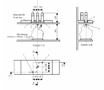 - Auf dem darüber liegenden Fachboden sind drei offene DGP aus Stahlblech ohne Ventil mit einem Durchmesser von jeweils 55 mm und mit einer Höhe von jeweils 200 mm so aufzustellen, dass sich eine DGP über der Mitte der Blechwanne befindet und dass sich die beiden anderen DGP über zwei diagonal gegenüberliegenden Ecken der Blechwanne befinden. Der Fachboden ist mit einer 50 mm dicken Mineralwollplatte abzudecken, deren Raummasse (Dichte) zirka 220 kg/m3 beträgt; in dieser Mineralwollplatte sind drei für die aufgestellten DGP passende Öffnungen auszuschneiden.