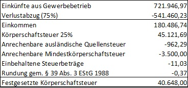 Für die Berechnung muss nicht nur der Zurechnungsbetrag (Differenz zu EUR 500.000) ermittelt werden. Es ist auch erforderlich, allfällige Verlustvorträge zu untersuchen. Für den Bereich der Einkommensteuer (nicht allerdings hier bei der Körperschaftsteuer) kommt aufgrund des progressiven Steuertarifs und entsprechender Sondervorschriften (Hälftesteuersatz, Progressionsvorbehalt etc.) dazu noch die mitunter komplizierte Steuerberechnung.