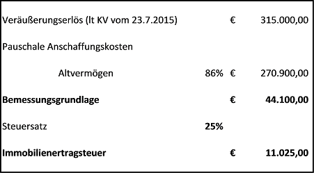 In einer Vorhaltsbeantwortung hat der Bf. den Kaufvertrag mit der Optionsgeberin vorgelegt. Vom indexangepassten Kaufpreis iHv 108.998,35 € wurde noch vertragsgemäß der Jahresmietzins iHv 726,73 € in Abzug gebracht. Die Anschaffungskosten betrugen demnach 108.271,62 € und ergeben unter Berücksichtigung des Veräußerungserlöses iHv 315.000,00 € eine Bemessungsgrundlage für die Immobilienertragsteuer iHv 206.728,38 €. Mit dem besonderen Steuersatz für Einkünfte aus Grundstücksveräußerungen iHv 25% berechnet sich eine Steuer iHv 51.682,10. Die Einkommensteuer für 2015 ist gerundet mit 97.049,00 € festzusetzen und verringert sich gegenüber dem angefochtenen Einkommensteuerbescheid um 88 €.
