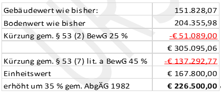 "Mit Feststellungsbescheid vom 2. Dezember 2004 stellte das Finanzamt für die verfahrensgegenständliche Liegenschaft zum 1. Jänner 2003 einen Einheitswert von 213.500,- EUR sowie einen gemäß dem AbgÄG 1982 um 35 % erhöhten Einheitswert von 288.200,-- EUR fest. Bei der Berechnung des Einheitswerts berücksichtigte das Finanzamt eine Kürzung um 30 % gemäß § 53 Abs. 7 lit. a BewG 1955. Mit Grundsteuermessbescheid vom selben Tag setzte das Finanzamt auf Basis des erhöhten Einheitswerts den Grundsteuermessbetrag zum 1. Jänner 2013 mit 570,92 EUR fest.