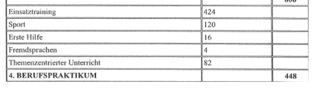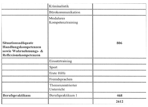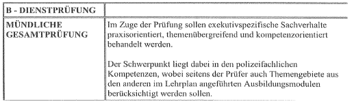 Der im Verfahren ausschließlich vorliegenden Stundentafel (einen Stundenplan, wann welche Einheiten absolviert wurden, hat die DG nicht vorgelegt), ist zu entnehmen, dass im Unterricht hauptsächlich Wissen und Handlungskompetenz vermittelt wurde. Praktische Einsätze erfolgten im Rahmen der Basisausbildung nicht. Als Schwerpunkte der polizeilichen Grundausbildung wurden Handlungssicherheit und Bürgernähe auf Basis menschenrechtskonformen Verhaltens definiert (Siehe Ausbildungslehrplan Seite 9).