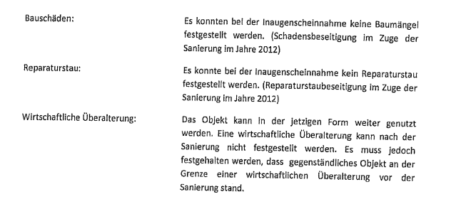 Das Gebäude sei demnach in Massivbauweise errichtet. Bei der Inaugenscheinnahme am 1.2.2013 nach der erfolgten Sanierung hätten keine Baumängel festgestellt werden können. Eine fehlende Dämmung gegen Schall, Wärme und Feuchtigkeit, mangelnde Verarbeitung und konstruktive und optische Mängel seien im Zuge der Sanierung beseitigt worden. Ein ursprünglich gegebener Reparaturstau sowie die drohende wirtschaftliche Überalterung sei bei der Sanierung beseitigt worden. Unter Punkt 4. des Gutachtens werden eine Reihe von wertbeeinflussenden Mängel vor Sanierung dargestellt (z.B.: Durchfeuchtungsschäden beim Zubau; reparaturbedürftige Fassade, Türen und Dacheindeckung; am Ende der Lebensdauer befindliche Treppen, Bodenbelege, Fenster, Elektroinstallation und Dachrinnen; erneuerungsbedürftige Heizung-, Warmwasser- und Sanitäranlagen; schlechter Allgemeinzustand). Die erheblichen Bauschäden am Zubau wurden (nach Ansicht des Richters im Widerspruch zu anderen Ausführungen im Gutachten) als nicht sanierbar bezeichnet.