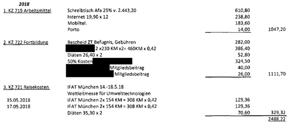 Der Bf. hat die von ihm als Werbungskosten geltend gemachten Beträge tatsächlich im jeweiligen Jahr und in der angegebenen Höhe entrichtet, soweit es sich dabei nicht um AfA, Tages- oder Kilometergelder handelt. Für keine der angeführten Positionen hat der Bf. einen Privatanteil angesetzt, sondern vielmehr jeweils den gesamten bezahlten Betrag als Werbungskosten geltend gemacht.