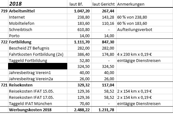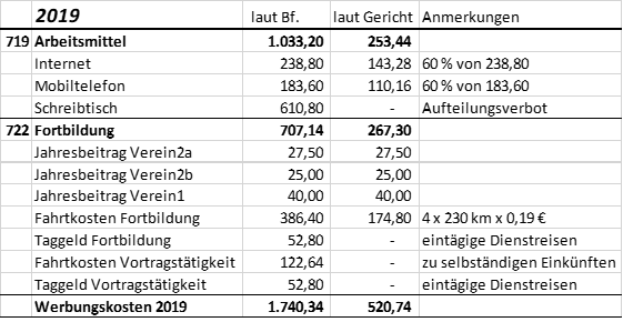 Zusammengefasst sind von den geltend gemachten Werbungskosten nach Ansicht des Gerichts nur jene abzugsfähig, die in den nachfolgenden Tabellen in der Spalte "laut Gericht" angeführt sind: