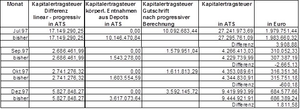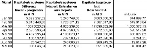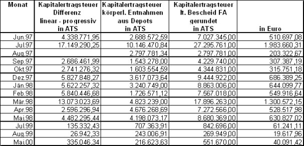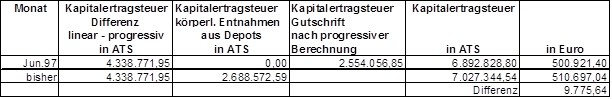 Der Einwand, dass das Aufkommen an Kapitalertragsteuer für den Fiskus ohnehin immer gleich sei, egal ob die Kapitalertragsteuer linear oder progressiv berechnet wird, übersieht, dass, wenngleich das Endergebnis gleich ist, während der Laufzeit Phasen auftreten, wo es krasse Unterschiede zwischen der linearen und progressiven Ermittlung gibt, die im Verhältnis zum inneren Wert zu ungerechtfertigt hohen Gutschriften aber auch Abzügen führen.