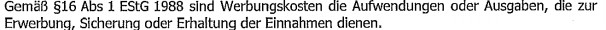 Gemäß § 16 Abs 1 EStG 1988 sind Werbungskosten die Aufwendungen oder Ausgaben zur Erwerbung, Sicherung oder Erhaltung der Einnahmen. Werbungskosten sind bei der Einkunftsart abzuziehen, bei der sie erwachsen sind.