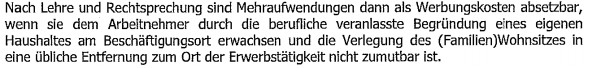 Der Haushalt in der Wohnung am Beschäftigungsort ist beruflich veranlasst, wenn ihn der Steuerpflichtige nutzt, um seinen Arbeitsplatz von dort aus erreichen zu können, wenn eine tägliche Rückkehr an den Wohnsitz der Familie wegen der Entfernung unzumutbar ist und ein Umzug der Familie des Arbeitnehmers an diesen Arbeitsort nicht möglich ist.