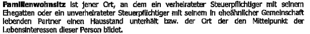 Als "Familienwohnsitz" im Sinne des Einkommensteuerrechtes gilt jener Ort, an dem ein verheirateter Steuerpflichtiger mit seinem Ehegatten oder ein lediger Steuerpflichtiger mit seinem in eheähnlicher Gemeinschaft lebender Partner (auch ohne Kind im Sinne des § 106 Abs 1 EStG 1988) einen gemeinsamen Haushalt unterhält, der den Mittelpunkt der Lebensinteressen dieser Person bildet.