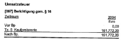 Anlässlich der Prüfung durch das Finanzamt Eisenstadt betreffend Jahre 2002 und 2003 wurde die Umsatzsteuer 1/2004 bis 4/2005 mitgeprüft. Bei dieser Prüfung lag die Verzichtserklärung betreffend Leibrente durch Herrn SF dem Finanzamt vor und ist offensichtlich auch die Betriebsprüfung unserer Meinung zum richtigen Ergebnis gekommen, dass ein Verzicht des Rentenstammrechtes keinesfalls die Bemessungsgrundlage für die Umsatzsteuer ändert, und lagen diese Erkenntnisse der benannten Behörde auch anlässlich der Veranlagung der Umsatzsteuer 2004 vor. Wir verweisen deshalb auf den Kommentar Stoll, BAO, Seite 2921, die ersten beiden Absätze oben; auf Seite 2931 letzter Absatz unten und 2937 letzter Absatz. Zusätzlich verweisen wir auf den Kommentar Ritz, BAO, Seite 940 Tz 15.