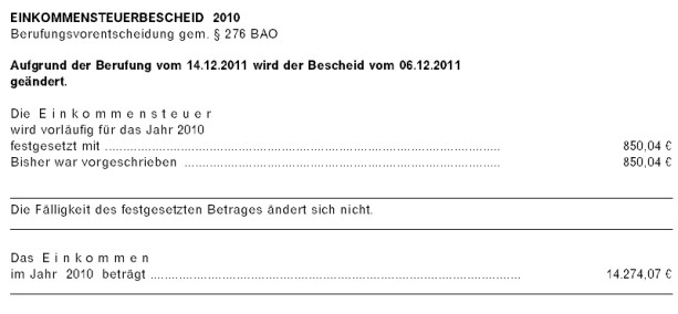 Mit Berufungsvorentscheidung vom 5.1.2012 wurde der Einkommensteuerbescheid 2010 dem Spruch der Berufungsvorentscheidung zufolge geändert. Tatsächlich blieben jedoch Bemessungsgrundlagen und Abgabenhöhe unverändert: