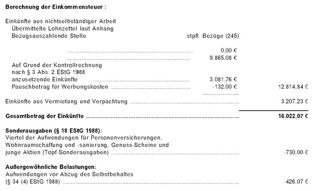 Gemeinsam mit Einkünften aus Vermietung und Verpachtung von € 3.207,23 ergab sich somit ein Gesamtbetrag der Einkünfte von € 16.022,07 und nach Abzug von Sonderausgaben, außergewöhnlichen Belastungen und des Kinderfreibetrags ein Einkommen von € 14.274,07, aus welchem eine Einkommensteuer von € 850,04 resultierte.