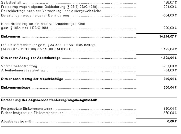 Wie sich dem Berechnungsblatt entnehmen lässt, folgt der UFS der Berechnung des steuerlichen Vertreters nur teilweise und gelangt zu einer erstattungsfähigen Negativsteuer (§ 33 Abs. 8 EStG 1988) von (gerundet, § 39 Abs. 3 EStG 1988) € -92,00.