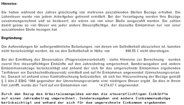 Begründend wurde hinsichtlich des Progressionsvorbehalts ausgeführt, dass bei der Ermittlung des Steuersatzes zunächst die steuerpflichtigen Einkünfte auf einen Jahresbetrag umgerechnet, Sonderausgaben und andere Einkommensabzüge berücksichtigt worden seien und anhand der sich für das umgerechnete Einkommen ergebenden Tarifsteuer ein Durchschnittssatz ermittelt und auf das Einkommen angewendet worden sei (Umrechnungsvariante).