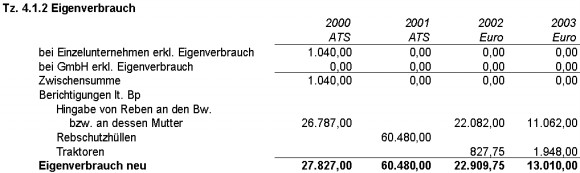 Tz. 2.2 Eigenverbrauch: Eigenverbrauch 2000 lt. Erklärung: ATS 1.040,00; Kürzung des erklärten Eigenverbrauchs lt. Bp: Eigenverbrauch betreffend Wein (siehe Tz. 1.2): ATS - 1.040,00; Eigenverbrauch lt. Bp ATS 0,00