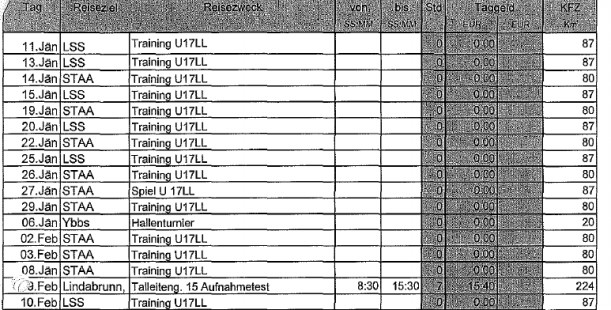 Ferner wurden handschriftliche Listen über "Trainings- und Spielfahrten 2010" vorgelegt, die jeweils enthalten: Datum, Uhrzeit (Beginn?), nähere Bezeichnung wie "Training", "Spiel U 17", "Turnier", abgekürzte Ortsangaben wie Landessportschule ("LSS") oder Stadtsportanlage ("STAA") und eine Kilometerangabe.