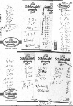 Über Ersuchen des Finanzamtes wurden (überwiegend) "Gasthauszettel" mit der Summierung von Beträgen ohne nähere Angaben, teilweise auch näher aufgeschlüsselte Rechnungen von Gastronomiebetrieben vorgelegt, die von Ihnen jeweils mit der Anmerkung "Info", "Informationsbeschaffung" o. ä. und einer Datumsangabe versehen wurden. Weitere Angaben sind nicht ersichtlich.