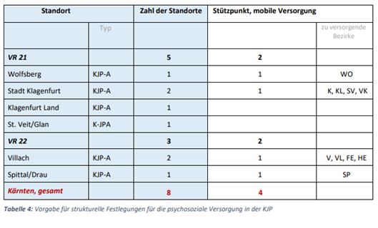 Soweit die Planung der psychosozialen Versorgung nach §1 Abs1 Z3 iVm Anlage 1 Punkt 9 der Verordnung betroffen ist, ist im Hinblick auf die verbindlichen (jeweils blau hinterlegten) Teile aus dem Regionalen Strukturplan Gesundheit – Kärnten 2025 nicht ersichtlich, dass darin bundesgesetzliche Vorschriften durchgeführt werden, die ihre Grundlage in Art10 B‑VG hätten (siehe bereits oben in Abschnitt II.2.). Vielmehr haben die strukturellen Vorgaben unter den Punkten 9.1 und 9.2 der Anlage 1 jeweils die Standorte und die Zahl der Ambulatorien iSv §2 Z5 und §13 K-KAO zur Versorgung von Erwachsenen bzw von Kindern und Jugendlichen zum Gegenstand, während sich die Regelung zur Durchführung von Hausbesuchen durch die Ambulatorien auf §2 Z5 letzter Satz und §13 Abs7 K-KAO stützt (vgl auch die Grundsatzbestimmungen des §2 Abs1 Z5 letzter Satz und §3a Abs7 KAKuG).