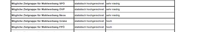 Mit Nachricht vom XXXX 2019 gab die BF der mP ua bekannt, welche Daten über die mP von der BF verarbeitet werden. Darunter fanden sich ua die Angaben zum Namen, Geburtsdatum, Adresse, sowie auch zur „möglichen Zielgruppe für Wahlwerbung SPÖ, ÖVP, Neos, Grüne, FPÖ“ mit dem Vermerk „statistisch hochgerechnet“ und jeweils „sehr niedrig“, „niedrig“ oder „hoch“.