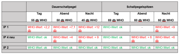 Durch die auftretenden spezifischen Schallimmissionen werden die tatsächlichen örtlichen Verhältnisse am Tag (6-18 Uhr) am IP 1 (MP1) um 11,6 dB angehoben und beträgt das Summenmaß dort 57,2 dB und überschreitet in diesem Beurteilungszeitraum des Planungsrichtwert gemäß ÖNORM S5021 für Dorfgebiet von 55 dB am IP 1 um 2,2 dB, wobei durch das Summenmaß der Basispegel um mindestens 18 dB überschritten wird. Am Abend (18-22 Uhr) werden die tatsächlichen örtlichen Verhältnisse dort um 14,2 dB angehoben, wobei das Summenmaß 57,1 dB beträgt und der Planungsrichtwert gemäß ÖNORM S5021 von 50 dB in diesem Beurteilungszeitraum um 7,1 dB überschritten wird und durch das Summenmaß der Basispegel um mindestens 20,3 dB überschritten wird.