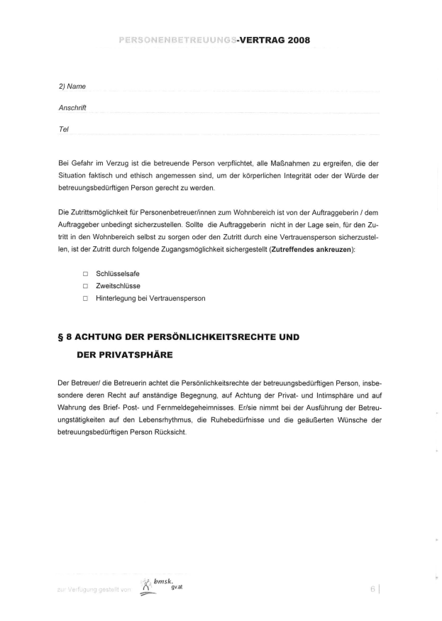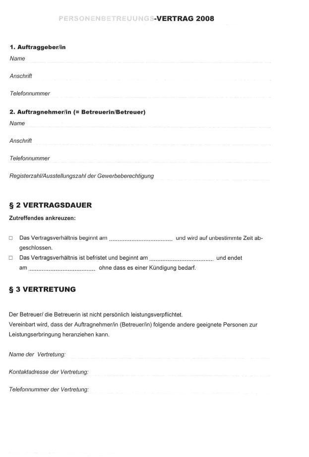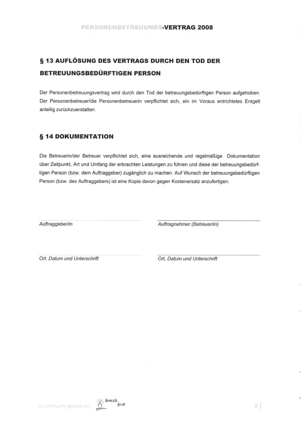 2. Der Auftrag endet automatisch bei nachhaltiger Veränderung des Betreuungsbedarfes, wenn selbständige Personenbetreuung nicht mehr erforderlich ist, wenn selbständige Personenbetreuung nicht mehr möglich ist und durch Tod des Klienten.