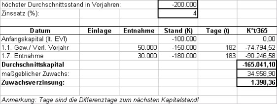 Als Eigenkapitalzuwachs sind der den Durchschnittsstand aus Vorjahren übersteigende Anfangsstand des Kapitalkontos und der Jahreszuwachs zu werten. Dass die Entnahme am Ende des Wirtschaftsjahres zu einem negativen Kapitalkontenstand führt, hat auf Grund der kurzen Dauer des Negativstandes praktisch keine Auswirkung auf den Jahresdurchschnittsstand, führt aber dazu, dass für die Folgejahre das höhere Durchschnittskapital dieses Jahres (82.178,08) als Bezugsgröße für den Kapitalzuwachs heranzuziehen ist.