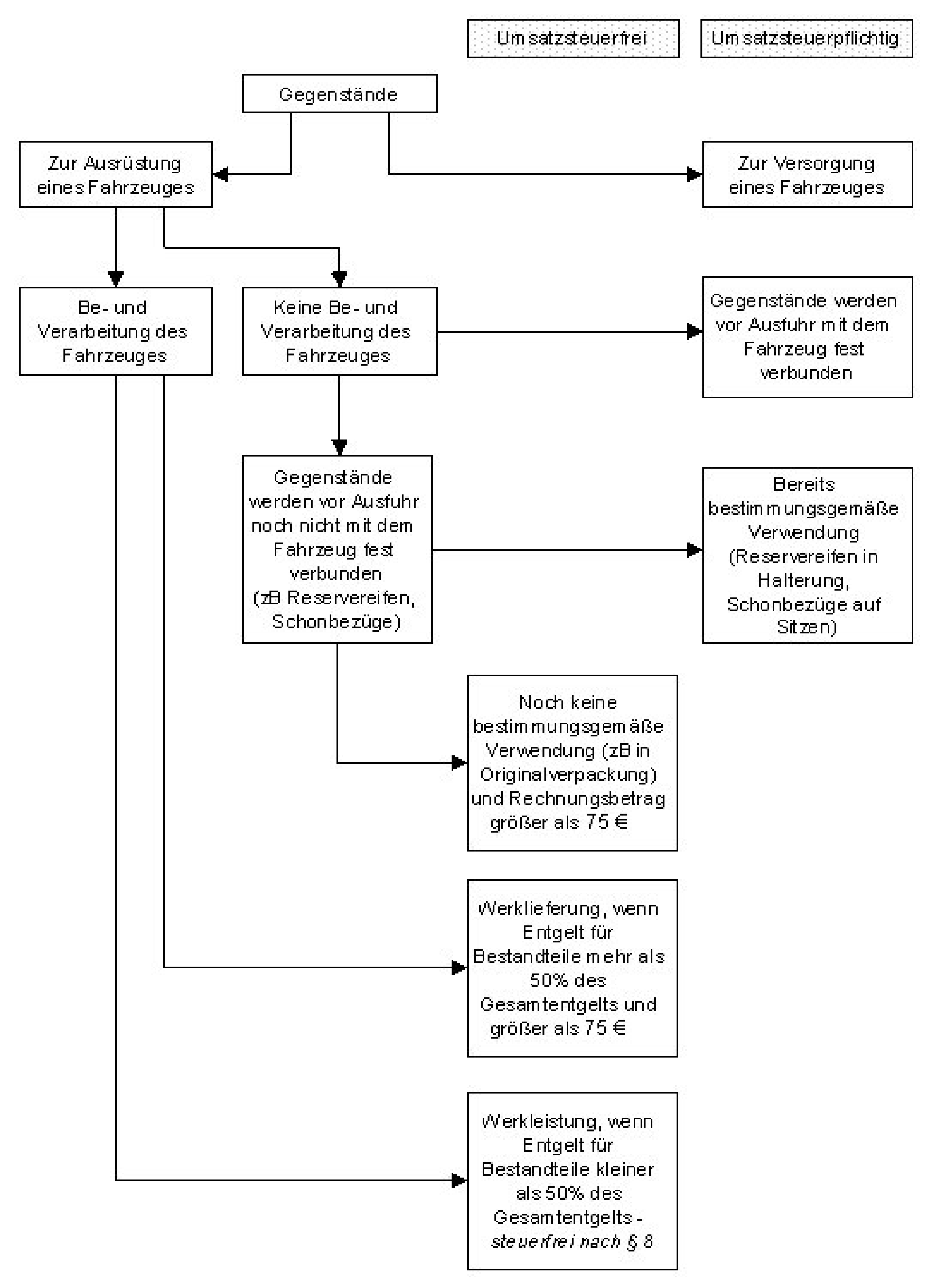 Dazu gehören zB Treibstoffe, die sich bei der Ausfuhr im Hauptbehälter oder Reservekanister des Fahrzeuges befinden, Motoröle, Bremsflüssigkeiten, Frostschutzmittel usw., die vor der Ausfuhr in das KFZ eingefüllt worden sind.7.3.5. Entscheidungsbaum