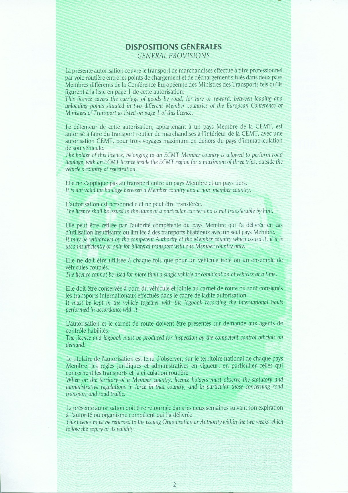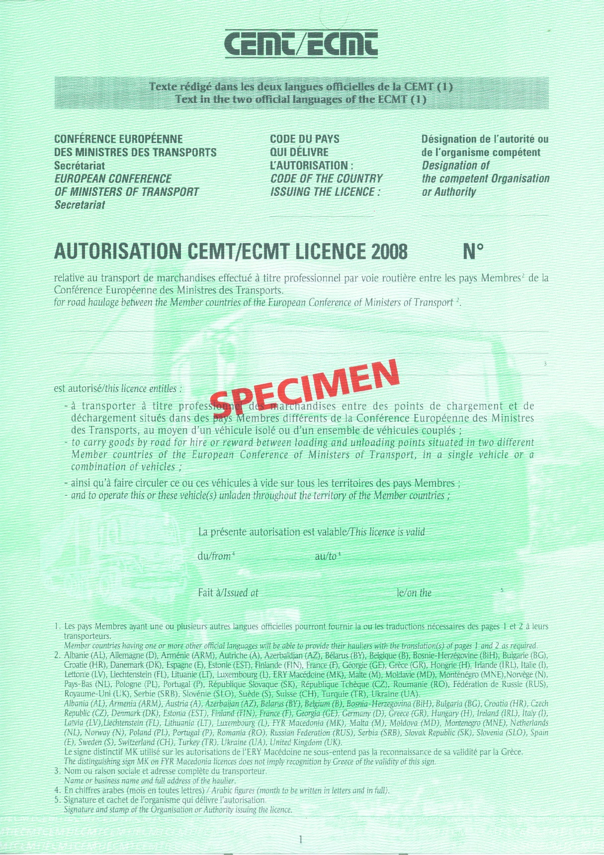 - Das Formular für die CEMT-Genehmigungen wurde geändert. Ab dem 1. Jänner 2008 sind CEMT-Genehmigungen nur anzuerkennen, wenn sie dem nachstehenden Muster (Vorder- und Rückseite) entsprechen: