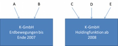 Mit Einbringungsvertrag vom 27.03.2008 bringen die Gesellschafter C, D u. E ihre Anteile an der T-GmbH zum 30.6.2007 in die K-GmbH ein. Damit ist die T-GmbH eine 100-prozentige Tochter der K-GmbH geworden (Gruppe ab 2008).