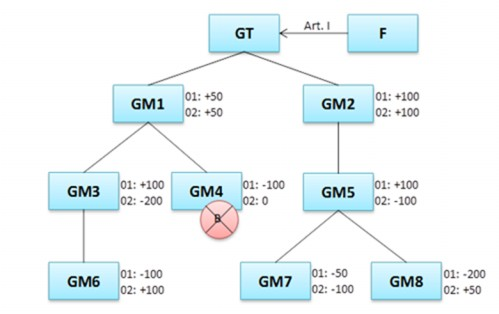 2. Handelt es sich im Beispiel 1 um eine 70%-Beteiligung an C, sind nach der Aufteilung A mit 21% und B mit 49% an C beteiligt. Die unverändert gegebene finanzielle Verbindung kann in diesem Fall nach § 9 Abs. 4 dritter Teilstrich KStG 1988 gegeben sein. Ist sie nicht gegeben, können A und B auch eine Beteiligungsgemeinschaft bilden.