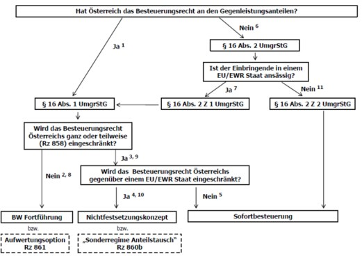 854b, 855 | Das "Prüfschema" zu grenzüberschreitenden Einbringungen wird hinsichtlich des Verzichts auf eine Gegenleistung präzisiert: Wird auf die Gewährung einer Gegenleistung verzichtet, gilt diese dennoch als bewirkt und besteht in der Werterhöhung der Anteile an der übernehmenden Körperschaft, die zu Lasten der im Inland steuerhängigen Anteile an der übertragenden Körperschaft erfolgt. Hat Österreich an den Anteilen der übernehmenden Körperschaft kein Besteuerungsrecht, ist im Anwendungsbereich von § 16 Abs. 2 UmgrStG zu unterscheiden, wo der Anteilsinhaber der übernehmenden Körperschaft ansässig ist. |