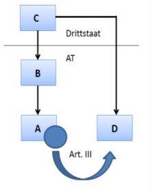Die inländische Körperschaft A bringt im Jahr 01 ihre italienische Betriebsstätte (Buchwert 10, gemeiner Wert 100) in die italienische Körperschaft B ein (Anrechnungsmethode im DBA Italien ). A stellt gemäß § 16 Abs. 1 zweiter Satz in Verbindung mit § 1 Abs. 2 UmgrStG einen Antrag auf Nichtfestsetzung der Steuerschuld (Bemessungsgrundlage iHv 90; eine allenfalls in Italien entstehende Steuerschuld wäre jedoch abzuziehen). Im Jahr 05 wird B auf die inländische Körperschaft C verschmolzen, an der die Körperschaft A wiederum 100% der Anteile hält. Da bei der konzernzugehörigen Körperschaft A die Steuerschuld ursprünglich nicht festgesetzt wurde, hat C die Betriebsstätte mit den fortgeführten Buchwerten anzusetzen. Aufgrund des Reimports zu Buchwerten kommt eine Festsetzung der Steuerschuld später nicht mehr in Frage.