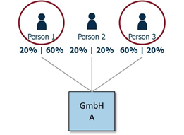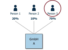 - eine natürliche Person oder mehrere natürlichen Personen gemeinsam direkt oder indirekt Kontrolle auf einen Rechtsträger ausübt bzw. ausüben, der wiederum einen Aktienanteil, eine Beteiligung oder Stimmrechte von mehr als 25% am meldepflichtigen Rechtsträger hält (Variante 1).
