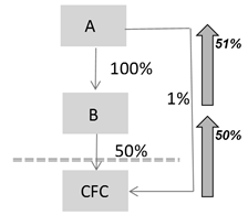 Die inländische A-GmbH hält 100% an der inländischen B-GmbH, die wiederum 50% an der im Staat X ansässigen, niedrigbesteuerten X-GmbH ("CFC") hält. Die A-GmbH selbst hält wiederum 1% unmittelbar an der X-GmbH.