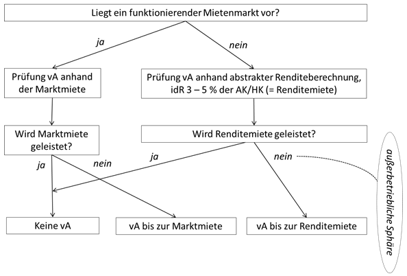 Eine GmbH erwirbt eine Wohnung und überlässt sie zunächst einem betriebszugehörigen Arbeitnehmer. Später wird die Wohnung vermietet. Diese Vermietung lässt auf Dauer gesehen keinen Gesamtüberschuss erwarten (Liebhaberei). Die Wohnung gelangt daher vom betrieblichen Bereich mittels "Entnahme" in den außerbetrieblichen Bereich. Die stillen Reserven zum Zeitpunkt des Wandels werden jedoch erst im Zeitpunkt der tatsächlichen Realisierung aufgedeckt (Näheres siehe LRL 2012 Rz 138 f).