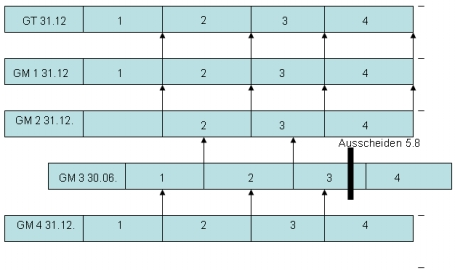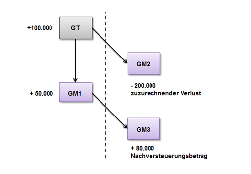 Gruppenträger und die vertikal verbundenen Gruppenmitglieder GM 1,2 und 4 haben den 31.12. als Bilanzstichtag. GM 3 als Beteiligungskörperschaft zu 2 hat den 30.6. als Bilanzstichtag. GM 3 erklärt am 5.8. seines Jahres 3 den Austritt aus der Gruppe. Dies hat zur Folge, dass GM 3 und GM 4 aus der Gruppe ausscheiden und eine Rückabwicklung mangels Erfüllung der drei Jahres Frist erfolgt. Von GM 3 sind keine drei Jahresergebnisse an GM 2 bzw. den GT zugerechnet worden. GM 4 hat zwar bis zum Ausscheiden von GM 3 drei volle Jahre hinter sich gebracht, die Zurechnung des Ergebnisses des Jahres 3 muss aber wegen des unterjährigen Ausscheidens von GM 3 unterbleiben.
