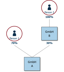 Beispiel direktes Eigentum: Person 3 ist direkter wirtschaftlicher Eigentümer der GmbH A, da Person 3 mit mehr als 25% an der GmbH A beteiligt ist. Die Personen 1 und 2 sind keine wirtschaftlichen Eigentümer, da diese mit weniger als 25% an der GmbH A beteiligt sind.