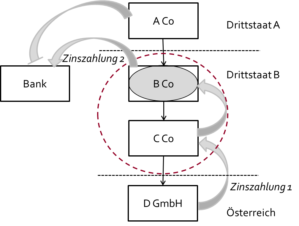 A Co, B Co, C Co und D GmbH sind verbundene Unternehmen. Die in Österreich ansässige D GmbH kann grundsätzlich die Zinszahlungen für ein Darlehen des im Drittstaat B ansässigen verbundenen Unternehmens C Co als Betriebsausgabe geltend machen. Unternehmen C Co berücksichtigt die Zinszahlung als Einkünfte, verrechnet diese jedoch im Rahmen eines Gruppenbesteuerungsregimes mit Ergebnissen des hybriden Unternehmens B Co, das eine Zinszahlung an eine Bank leistet. Da B Co aus Sicht des Drittstaates A als steuerlich transparent gilt, wird die Zinszahlung als Betriebsausgabe bei der A Co zugelassen und damit zweimal in Abzug gebracht; eine Verrechnung mit doppelt berücksichtigten Einkünften findet aufgrund der ausländischen Gruppenbesteuerung nicht statt (hybride Gestaltung iZm DD-Steuerdiskrepanz im Sinne des § 14 Abs. 3 Z 2 KStG 1988).