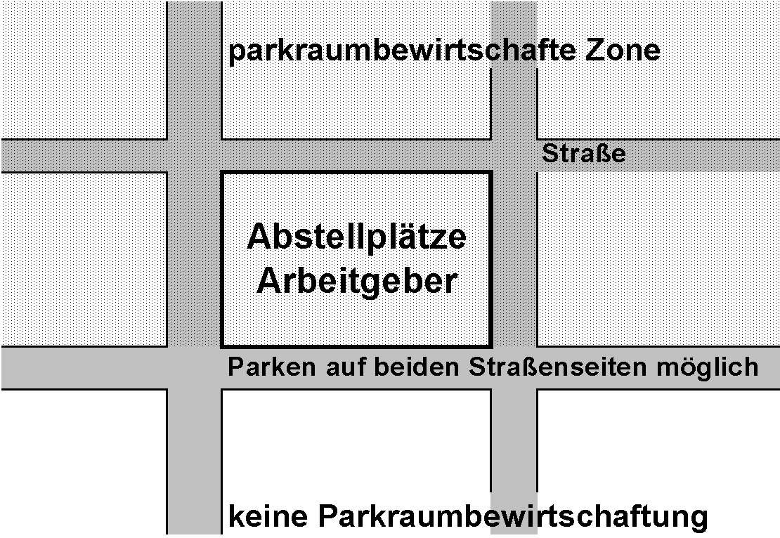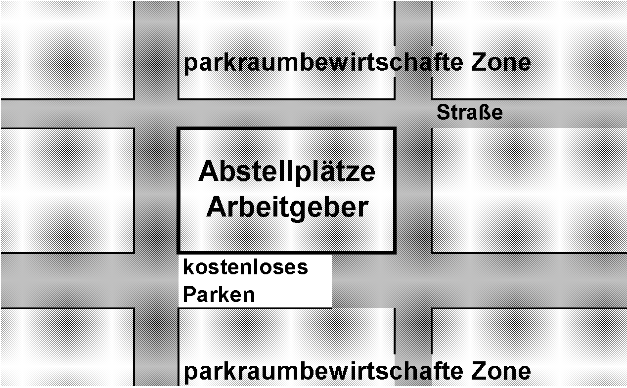 1) Die Abstellplätze einiger größerer Arbeitgeber liegen am Rand der gebührenpflichtigen Parkzone und zwar so, dass das Abstellgelände zumindest auf einer Seite von einem Straßenzug begrenzt wird, die nicht mehr zur gebührenpflichtigen Parkzone gehört.
