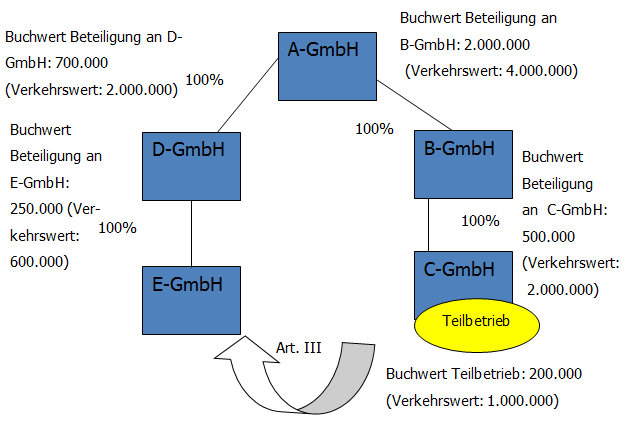 Die A-GmbH ist Alleingesellschafterin der B-GmbH, der Buchwert der Beteiligung beträgt 2.000.000 (Verkehrswert 4.000.000) und Alleingesellschafterin der D-GmbH, der Buchwert der Beteiligung beträgt 700.000 (Verkehrswert 2.000.000). Die B-GmbH ist Alleingesellschafterin der C-GmbH, der Buchwert der Beteiligung beträgt 500.000 (Verkehrswert 2.000.000). Die D-GmbH ist Alleingesellschafterin der E-GmbH, wobei der Buchwert der Beteiligung 250.000 (Verkehrswert: 600.000) beträgt. In der Bilanz der C-GmbH befindet sich ein Teilbetrieb X mit einem Buchwert von 200.000 (Verkehrswert 1.000.000). Die C-GmbH bringt ihren Teilbetrieb X unter Verzicht auf eine Gegenleistung in die E-GmbH ein.