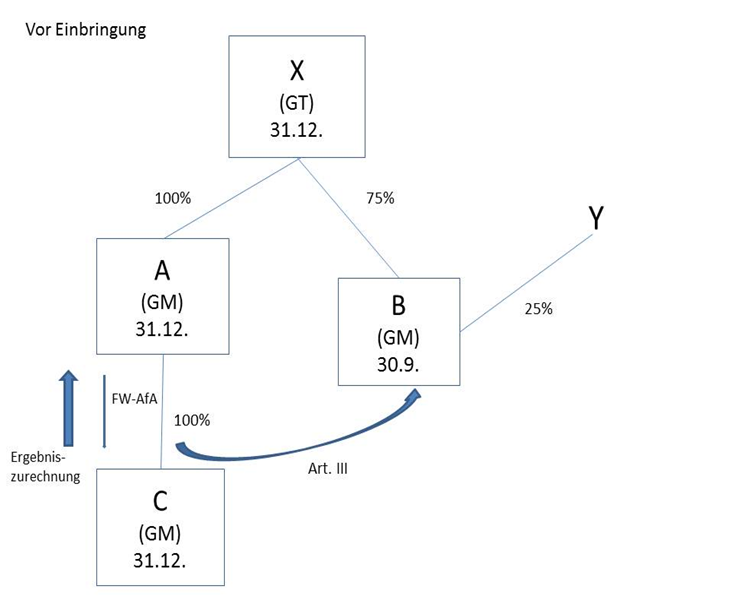 Der Gruppenträger X hält am Gruppenmitglied A 100% der Anteile. Das Gruppenmitglied A hält 100% der Anteile am Gruppenmitglied B, welches wiederum 51% der Anteile an Gruppenmitglied C hält. A bringt zum 31.12.01 begünstigtes Vermögen in das Gruppenmitglied C gegen Gewährung von Anteilen ein. Die Firmenbuchanmeldung erfolgt am 29.9.02.