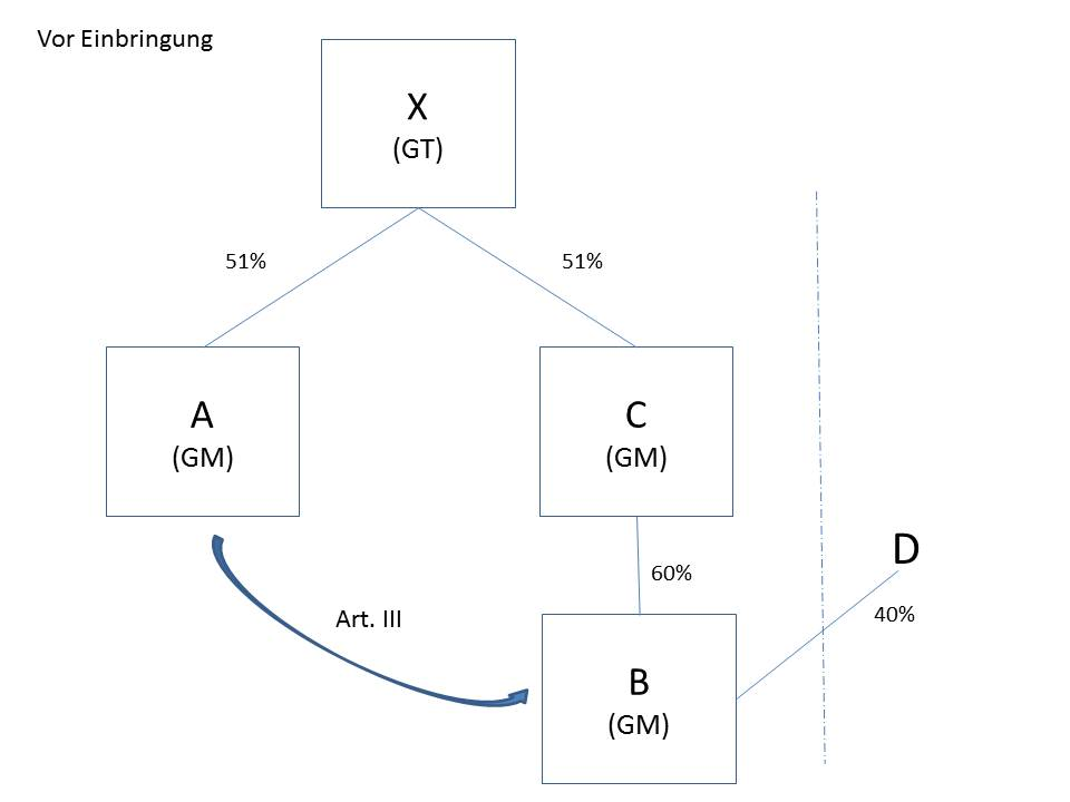 Die Einbringung erfolgt gegen Gewährung neuer Anteile gemäß § 19 Abs. 1 UmgrStG, wodurch sich die Beteiligung des Gruppenträgers X zum auf den Einbringungsstichtag folgenden Tag auf 60% vermindert und A in weiterer Folge ab diesem Stichtag zu 20% an B beteiligt ist.