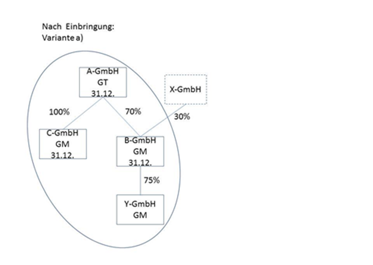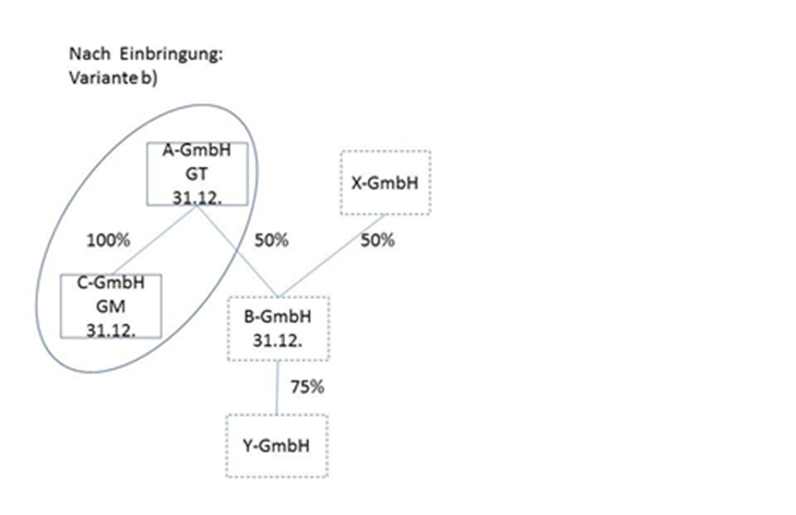 Die Unternehmensgruppe besteht aus der A-GmbH als Gruppenträger, der 100-prozentigen Tochter B-GmbH und der 100-prozentigen Tochter C-GmbH. Alle Gesellschaften bilanzieren auf den 31.12. Die unbeschränkt steuerpflichtige Y-GmbH bringt ihren Betrieb zum 31.12.02 in die B-GmbH gegen Gewährung neuer Anteile ein, sodass die Y-GmbH nach der Einbringung an der B-GmbH im Ausmaß von