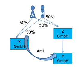 Die natürlichen Personen A und B sind zu je 50% an der inländischen X-GmbH und an der inländischen Y-GmbH beteiligt. Zum 31.12.X1 bringen A und B ihre Anteile an der X-GmbH gemäß Art. III UmgrStG in die Y-GmbH ein.