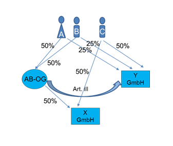 Die natürlichen Personen A und B sind zu je 50% an der betriebsführenden AB-OG beteiligt. Die OG hält einen Kapitalanteil in Höhe von 50% an der X-GmbH; ebenso hält die natürliche Person C 50% der Anteile an der X-GmbH. Die AB-OG und C bringen ihre Kapitalanteile an der X-GmbH in die Y-GmbH nach Art. III UmgrStG ein. An der übernehmenden Y-GmbH sind A und B zu je 25% und C zu 50% beteiligt.
