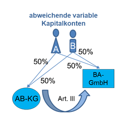 Die natürlichen Personen A und B sind zu je 50% am fixen Kapital der inländischen AB-KG und zu je 50% an der inländischen BA-GmbH beteiligt. Die Beteiligung am variablen Kapital von A und B weicht von deren Beteiligung am fixen Kapital ab. Zum 31.12.X1 bringen A und B ihre Mitunternehmeranteile an der AB-KG in die BA-GmbH gemäß Art. III UmgrStG ein. Die dabei entstehende Äquivalenzverletzung wird durch eine alineare Gewinnausschüttung ausgeglichen.