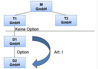Für die A-GmbH ist durch die Spaltung eine internationale Schachtelbeteiligung entstanden. Dies hat zur Folge, dass die in den Anteilen an den untergegangenen Beteiligungen enthaltenen stillen Reserven in Form einer Ausnahme von der Steuerneutralität an der Nachfolgegesellschaft C-GmbH steuerhängig bleiben. Bei der B-GmbH ersetzt die 100% Beteiligung an der D-GmbH die internationalen Schachtelbeteiligungen an den übertragenden Gesellschaften.