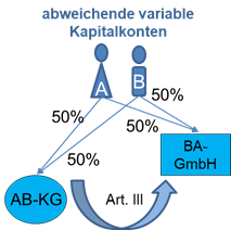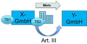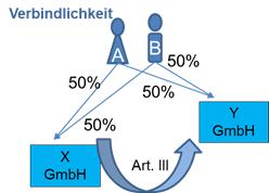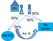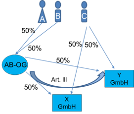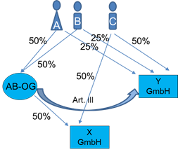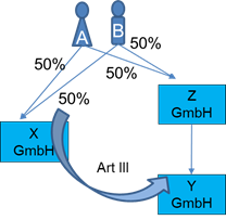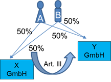 An der deutschen Y-GmbH und der deutschen Z-GmbH sind die inländische A-GmbH mit jeweils 5% und die inländische B-GmbH mit jeweils 95% beteiligt. Die beiden deutschen Kapitalgesellschaften werden nicht verhältniswahrend auf die neugegründeten deutschen Kapitalgesellschaften C-GmbH und D-GmbH dergestalt aufgespalten, dass die A-GmbH 100% der Anteile an der C-GmbH und die B-GmbH 100% der Anteile an der D-GmbH erhält.